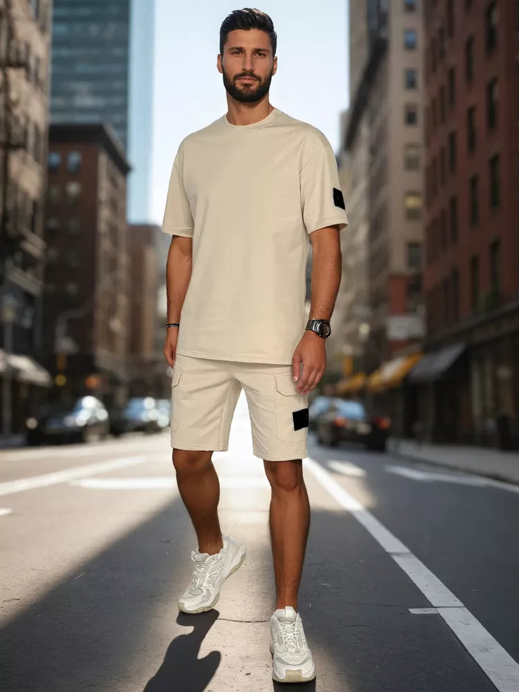 A modern men's set consisting of a shirt and shorts. The short-sleeved shirt with buttons on the shoulder adds style. The four-pocket shorts with an elastic waistband and decorative details create a cohesive urban look. The soft material ensures comfort in everyday spring styles.