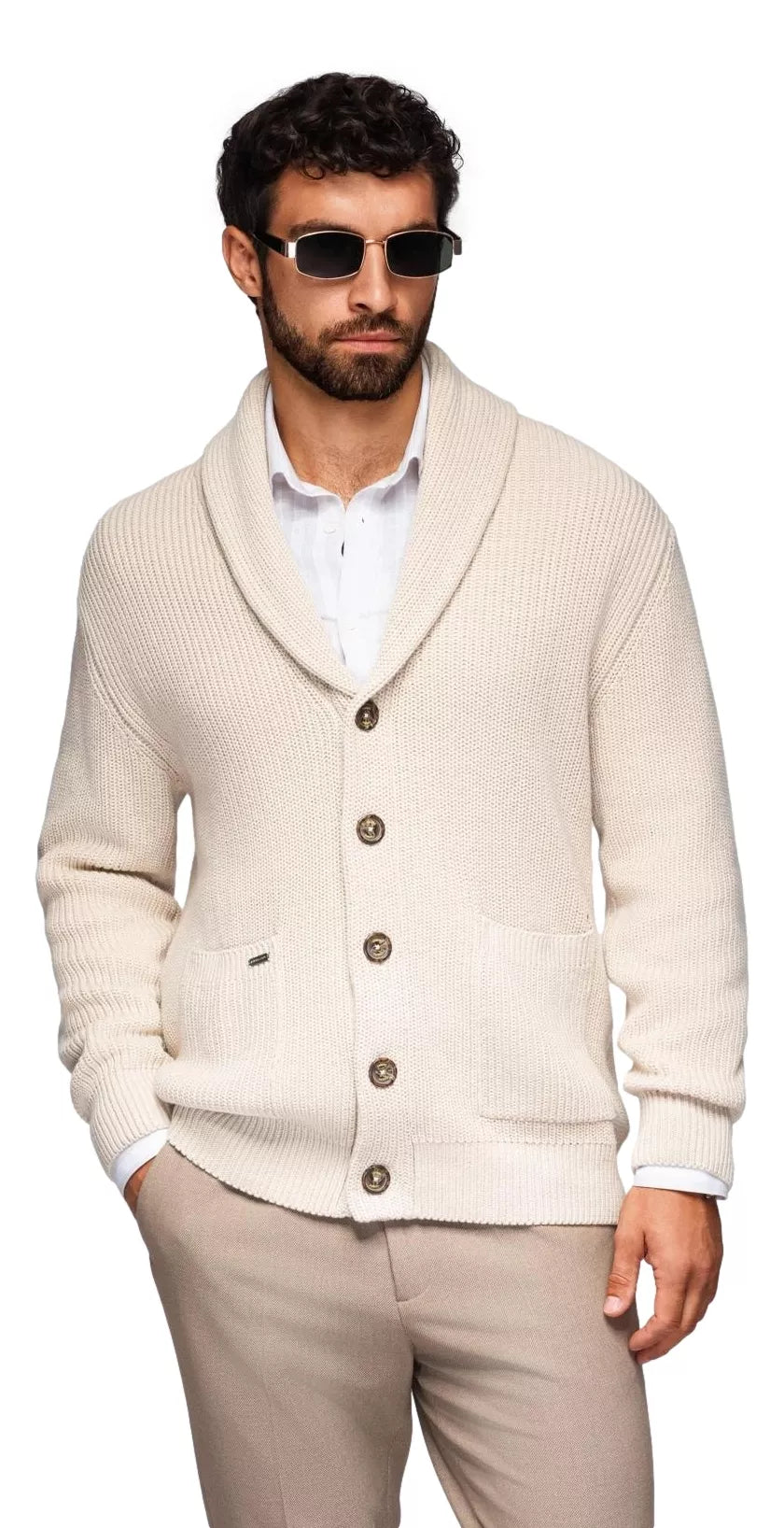 Stylish - a great choice for men who value comfort and elegance. Made of pleasant to the touch material made of pure cotton, it features an exclusive collar and patch pockets. The classic regular cut and smooth fabric allow the sweater to perfectly match both everyday and more elegant styles. Details such as branded buttons and a metal clasp give it a modern look. There are pockets on the front. Material: 100% cotton The model is 188 cm tall. The product is in size M.