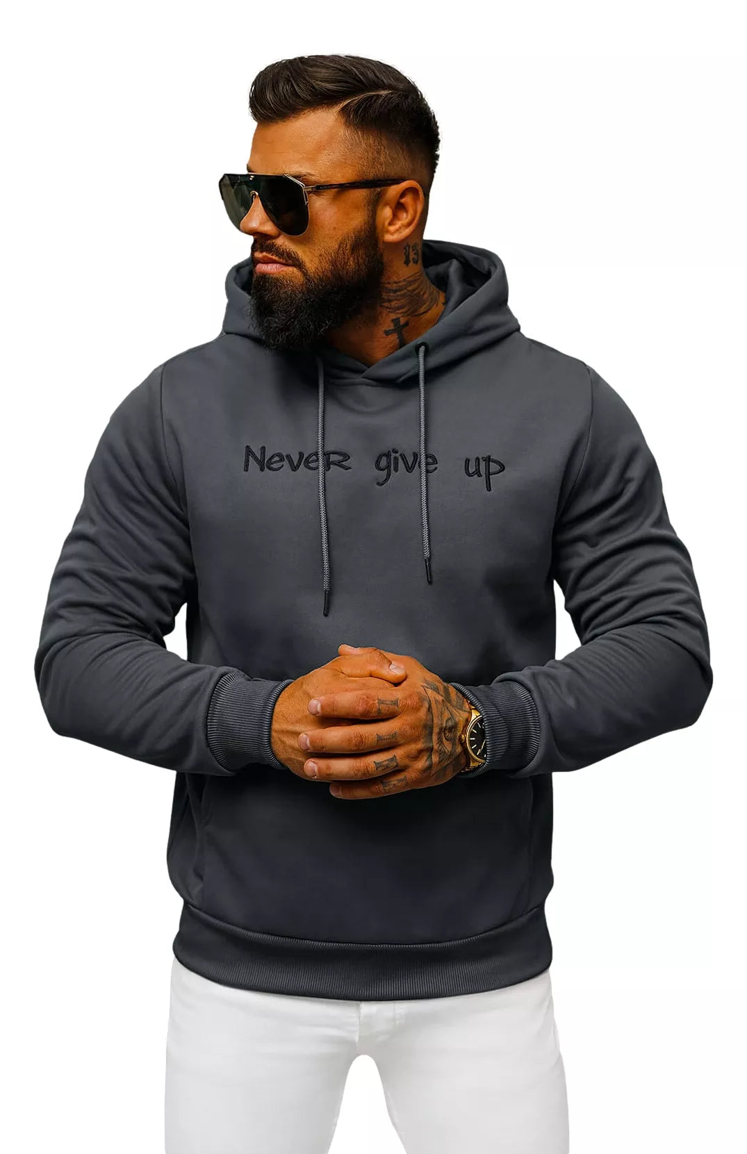 A sweater with a fashionable inscription, has a large pocket on the front and a hood.