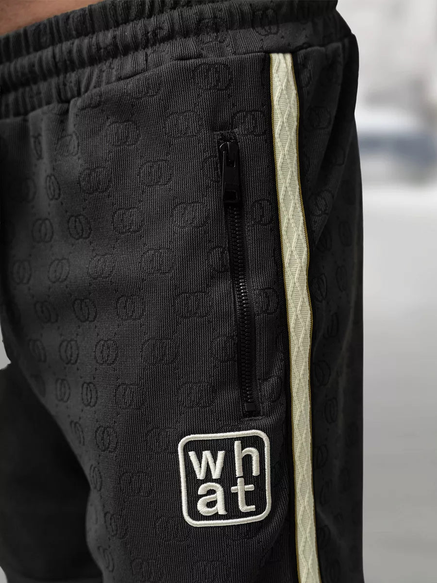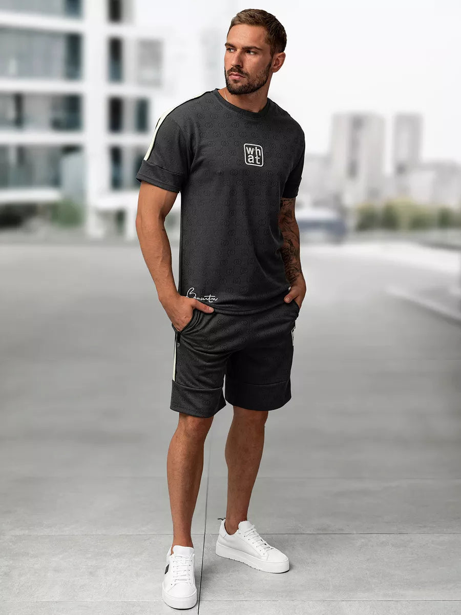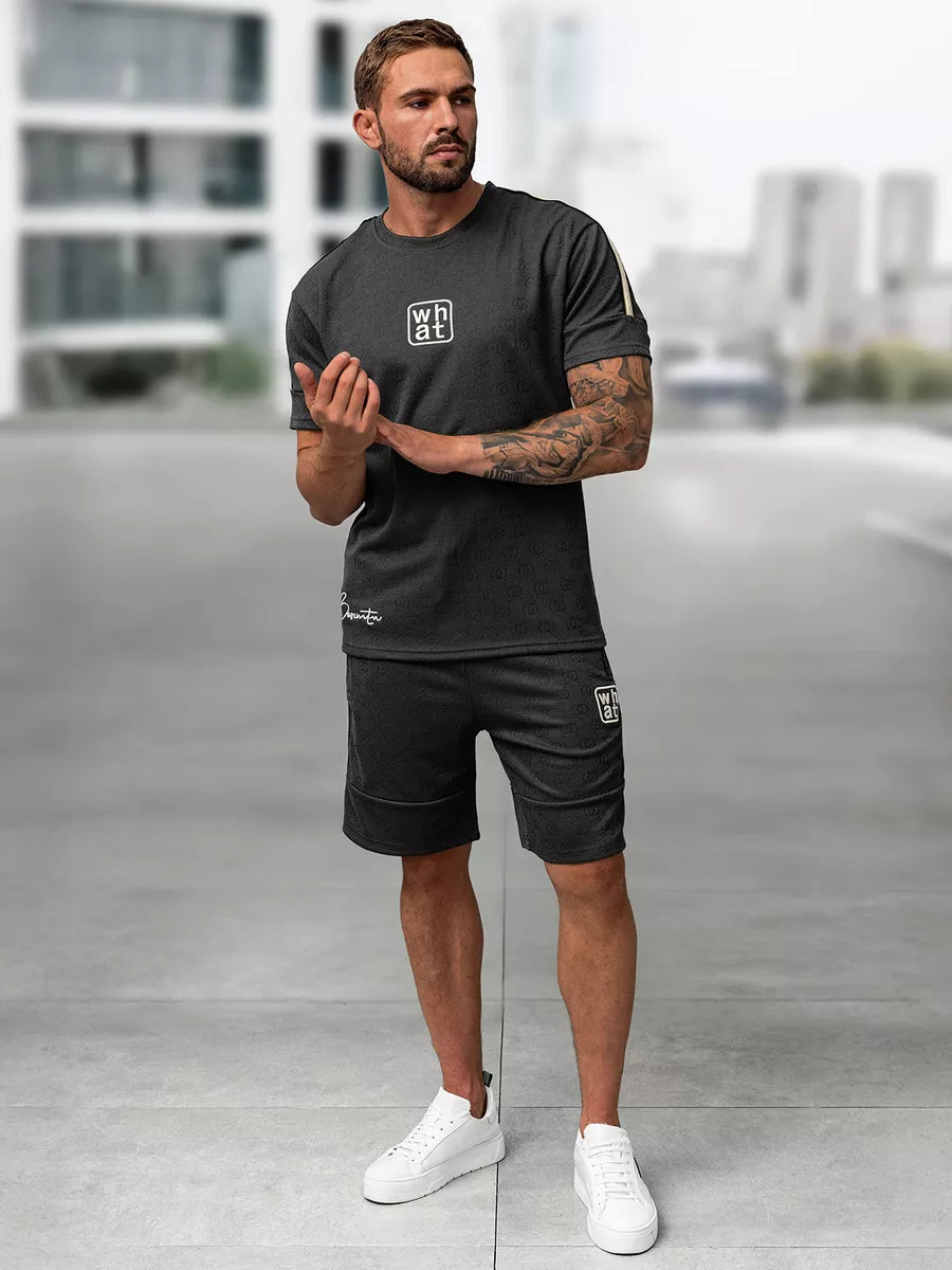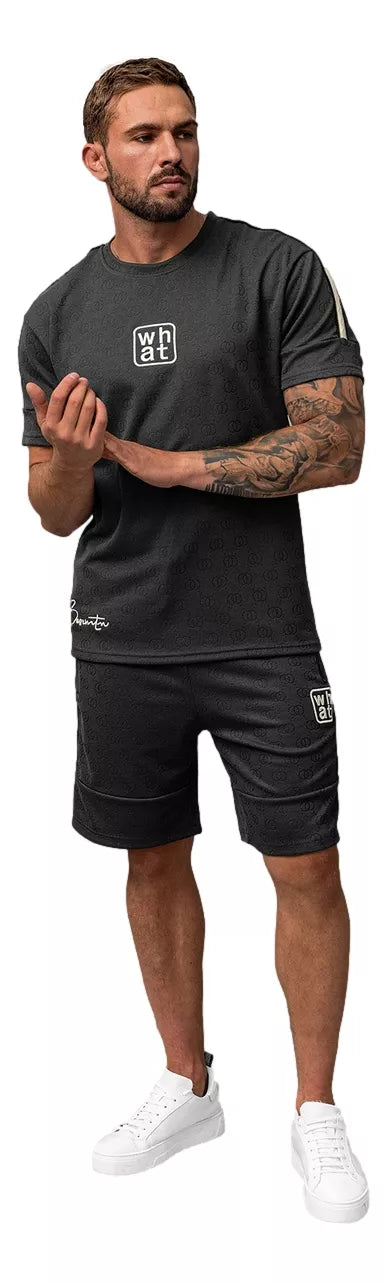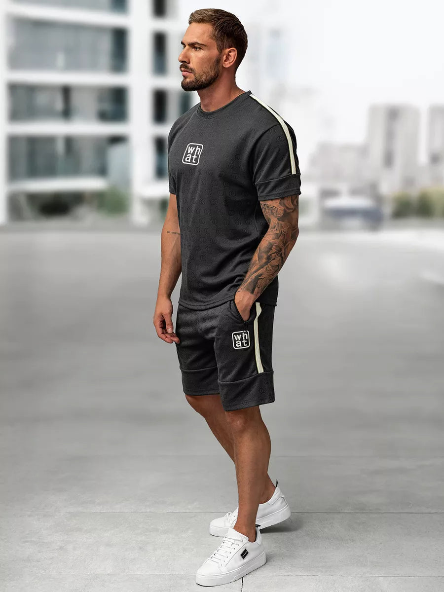 The t-shirt features a minimalist "what" print on the chest and a white ribbon along the shoulder. The shorts, with pockets and a decorative side stripe, perfectly match the t-shirt. The set is ideal for both active leisure and everyday style.