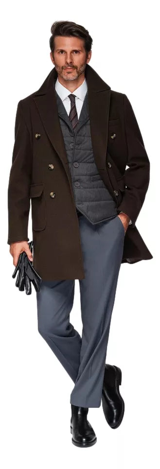 Asymmetrical men's viscose coat will add elegance to your masculine style. The main motif of this coat is simplicity and class - pleated buttons and side seams, combined with a uniform color scheme, create a stylish whole. The unique design of the coat allows you to combine it with various everyday and outfit compositions. The delicate, soft material with a touch of viscose gives the coat a casual feel and comfort. Men's long coat, asymmetrical single-breasted button fastening with hidden vent. High collar with stand-up collar, two functional side pockets, one inside pocket. Material - 90% polyester, 10% viscose.