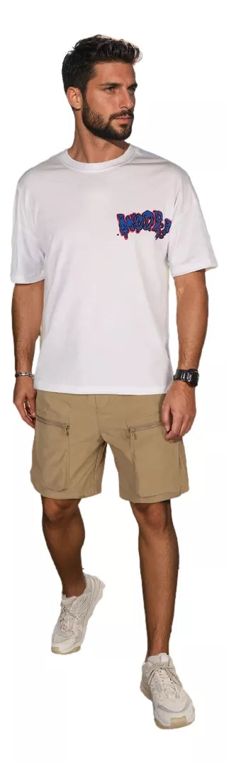 Men's loose-fitting T-shirt, perfect for everyday wear and urban style. There is a contrasting print on the front and a large graffiti image on the back, which attracts attention and gives it a street style character. The classic round neckline ensures comfort, and the breathable material makes the model perfect for the spring season.