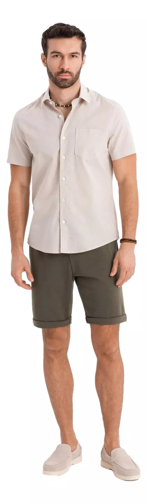 Men's shorts will go perfectly with casual wear. The uniform color and classic cut are highlighted by subtle details that give the shorts a unique character. The waist is adjustable with drawstrings. Two front chino pockets,pleats imitating back pockets.