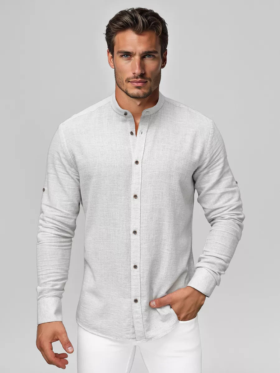 Light gray men's t-shirt is a great choice for those who value style and comfort. The t-shirt features a minimalist design with a round collar and a subtle neckline, complemented by buttons at the front. The soft and smooth material ensures comfort all day long, and the fitted sleeves create an elegant silhouette.