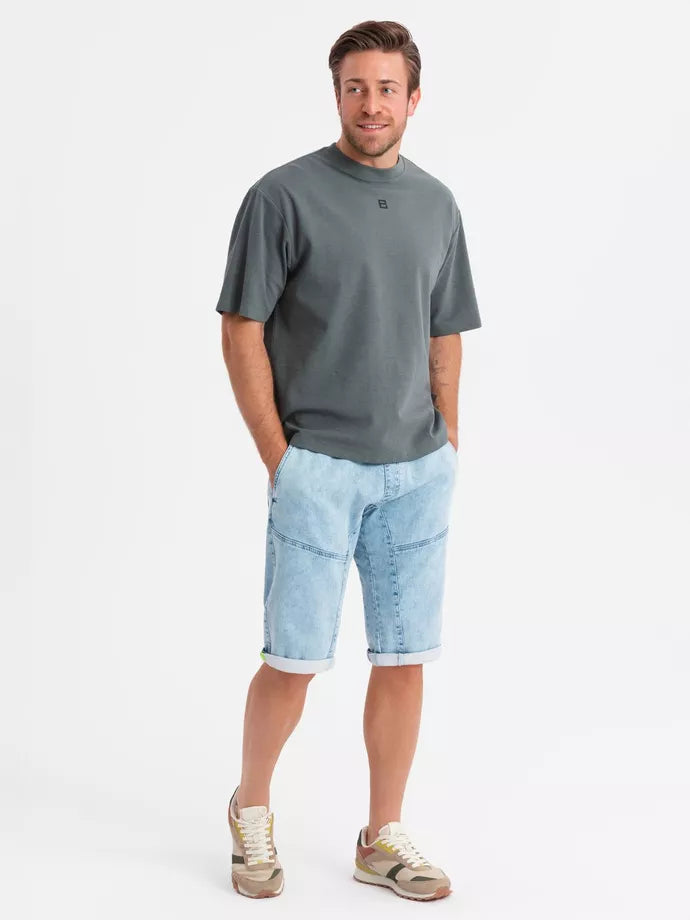 Men's stretch denim shorts are the perfect combination of comfort and street style. Soft fabric with a worn effect ensures comfortable wear in any situation, while decorative seams and rolled-up legs give an urban accent. The shorts have practical pockets and an elastic waistband with a drawstring, so they adapt to the figure. This model is perfect for both festive style and everyday wear. There is a neon band at the leg, metal accessories with a logo.