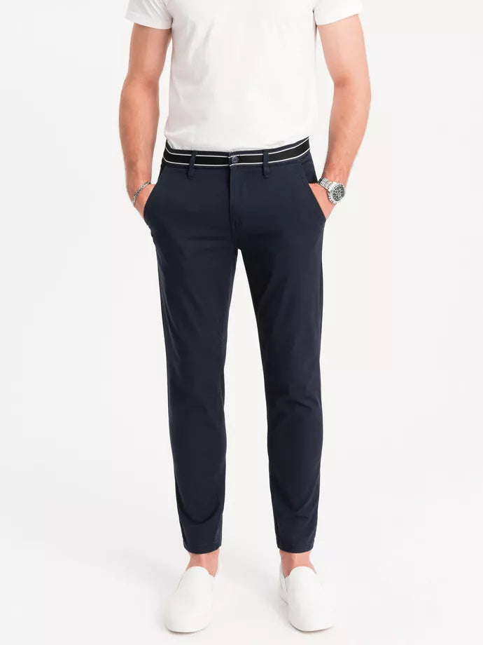 Chinos are the quintessence of masculine elegance, and this model is perfect for special occasions. They will add class to any style, both casual and formal. The decorative trim, reminiscent of a belt, clearly highlights the waist, emphasizing the advantages of the silhouette. Cotton with added elastane allows the trousers to fit better to the body. There are two pockets in the front, two back pockets with buttons